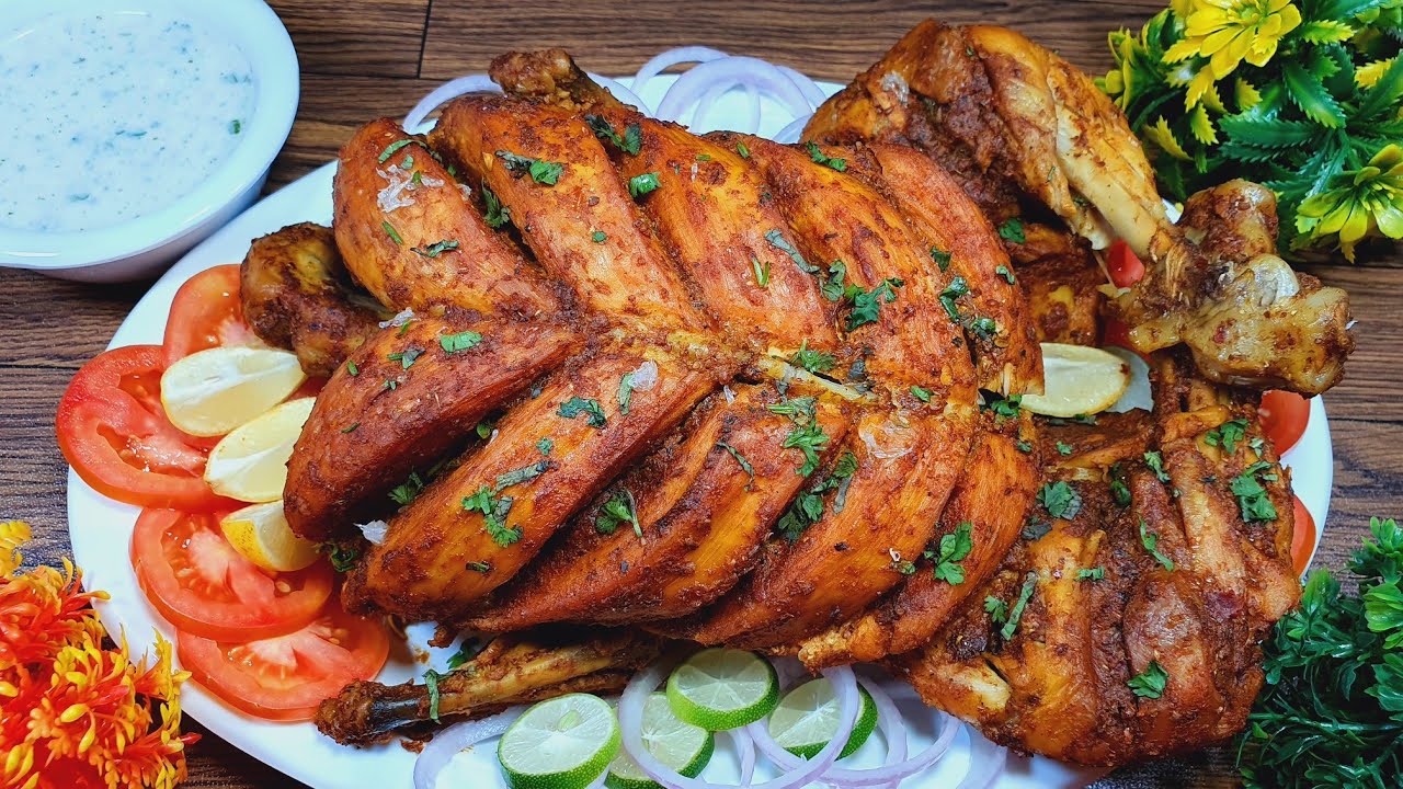 Whole marinated chicken deep-fried to golden perfection with a crispy exterior and tender interior.